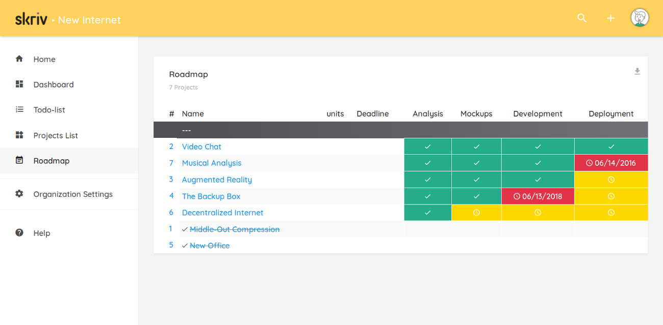 When you create a project, Skriv calculates intermediate deadlines for all steps. If some are already late, they appear in red. It's simple and obvious for everyone.